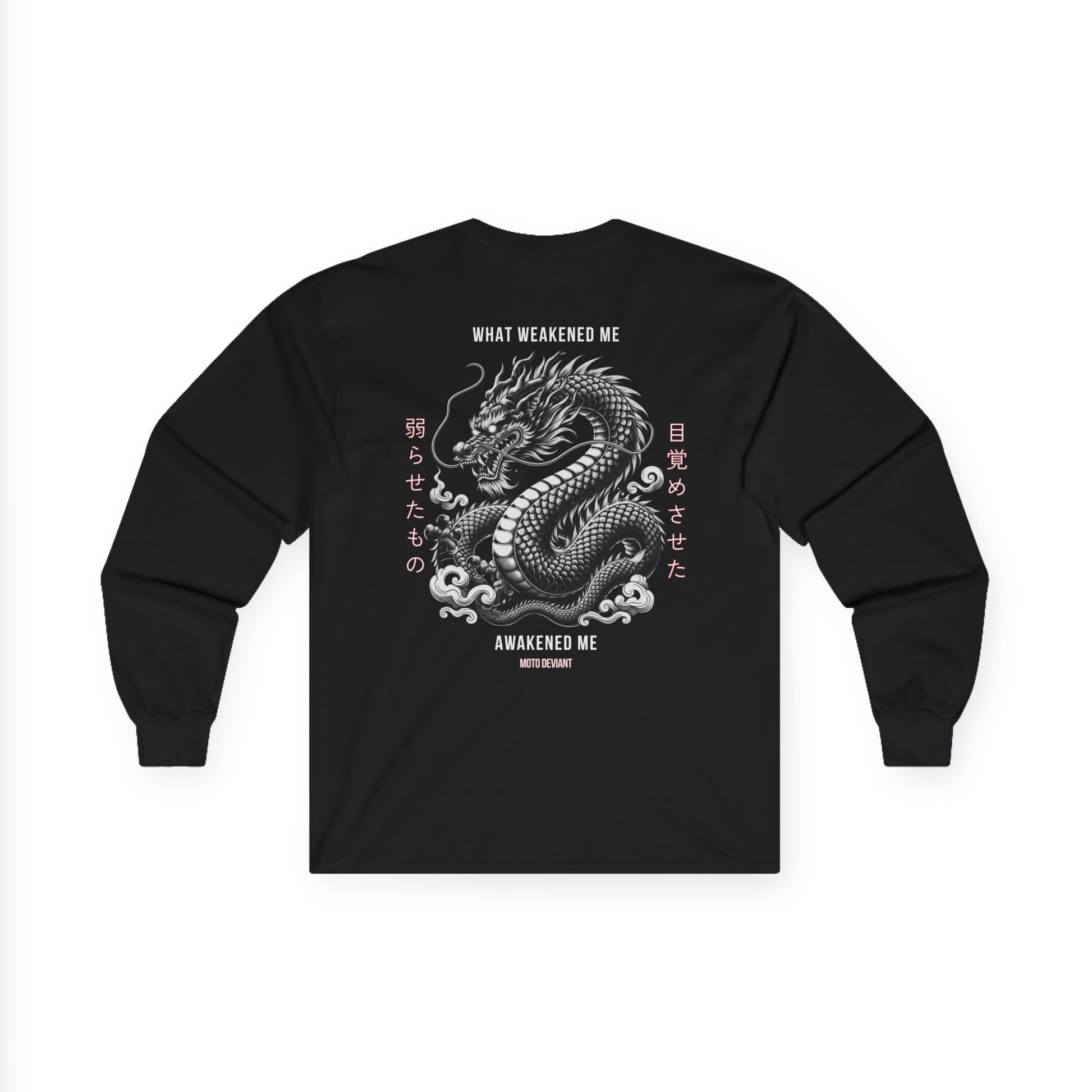The Awaken The Weak Long Sleeve is designed with tattoo-style placement and Japanese framing, featuring the awakened dragon as the centerpiece.