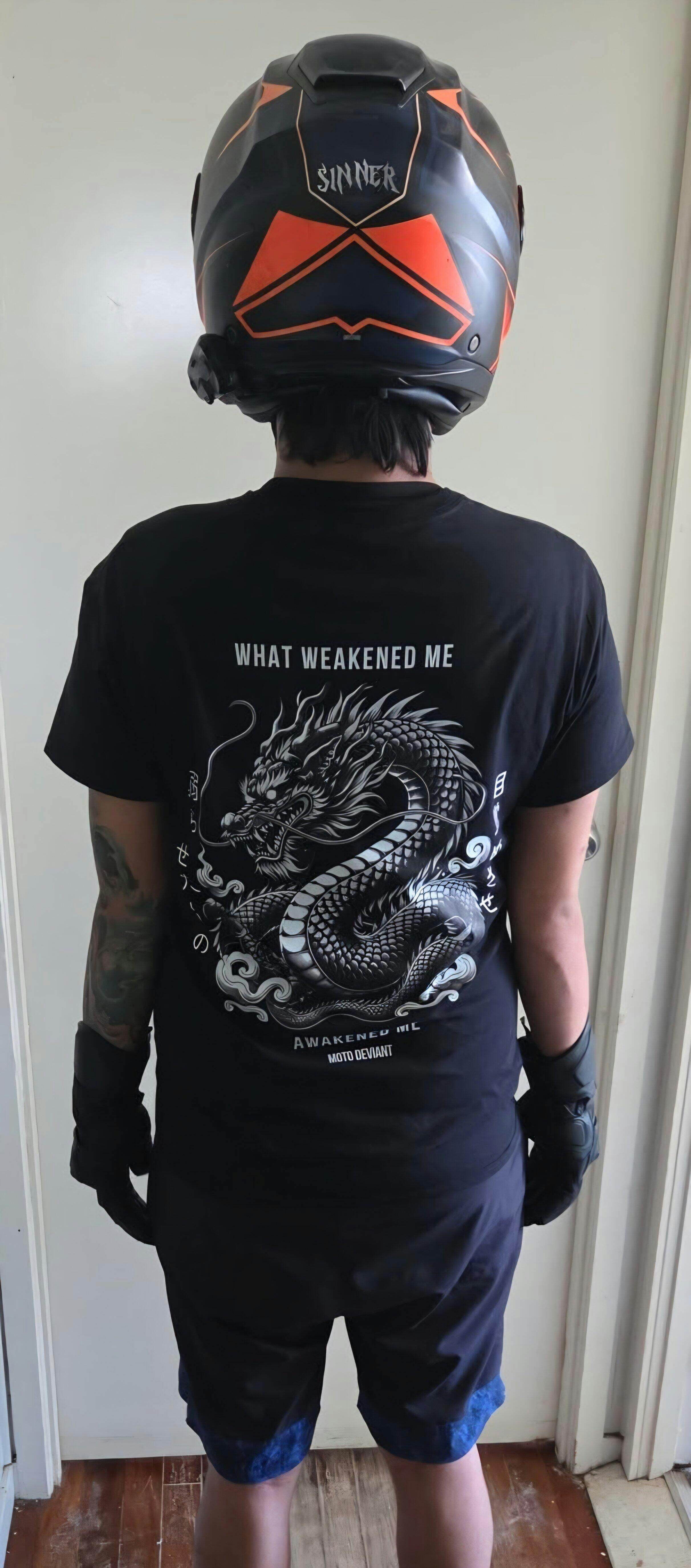 The Awaken The Weak T-Shirt features a hand-illustrated Japanese dragon wrapped with the message: